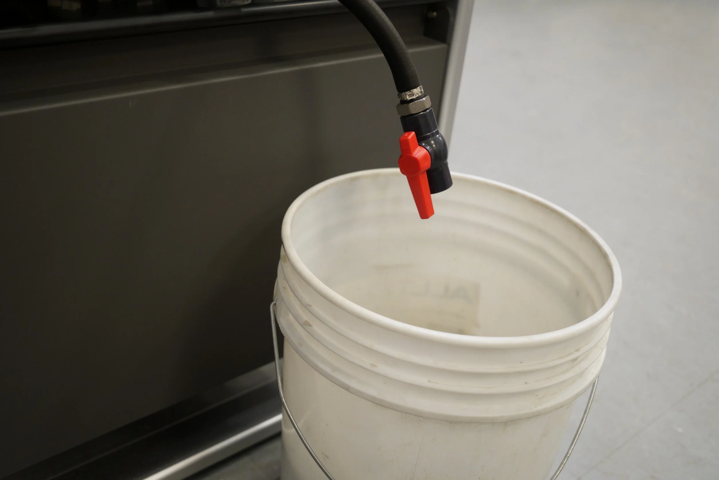 1. First, untether the hose and point the valve into a bucket. The female thread on outlet of the valve is 1/2 BSPT and a longer hose or pump can be attached to make this process easier.