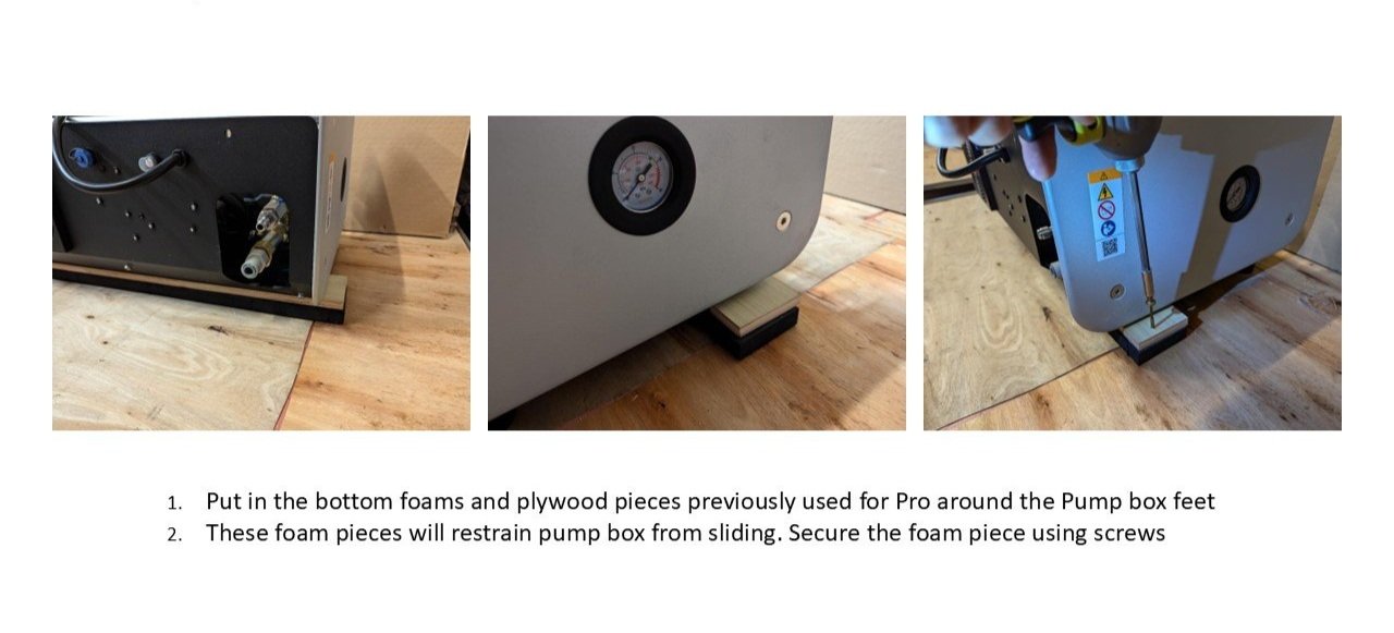 4. Put in the bottom foams and plywood pieces previously used for Pro around the Pump box feet. These foam pieces will restrain pump box from sliding. Secure the foam piece using screws