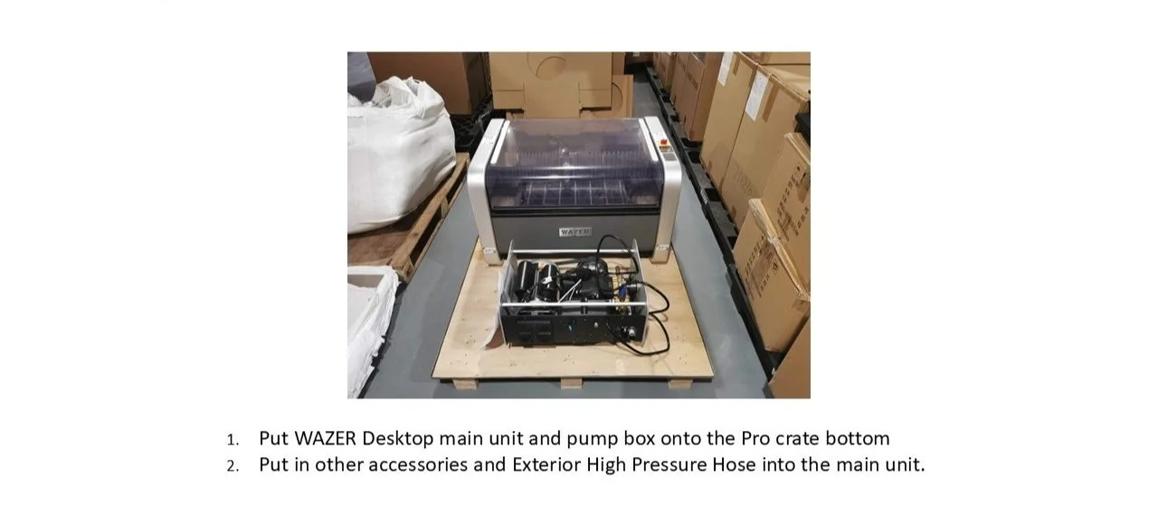 3. Put main unit and pump box onto the Pro crat bottom. Put in other accessories and exterior high pressure hose into the main unit.
