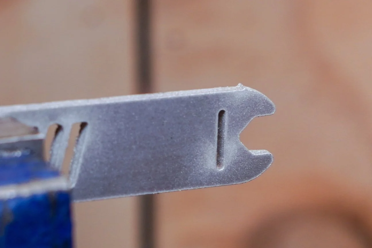 How it works? Simply put, the curved section hooks into the burr, and user scraps the burrs away from the part with a single motion. The curved section is on a swivel head, so it can always hook on the burrs, and can reach be used in tight spots like the inside of a circular cut out.
