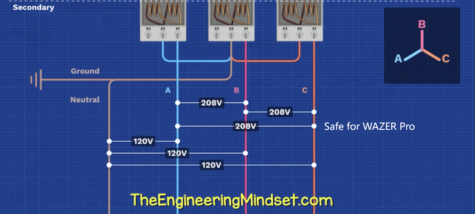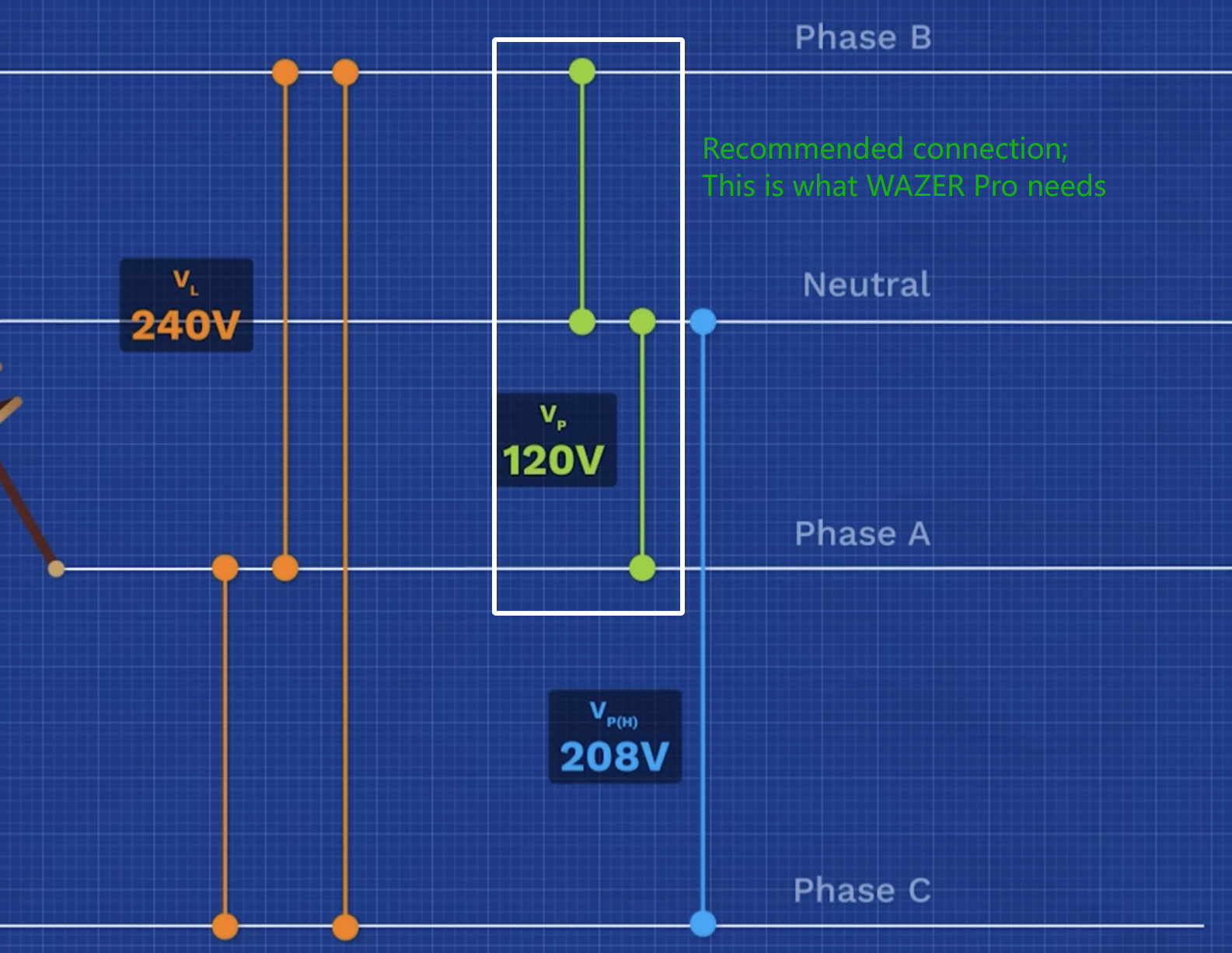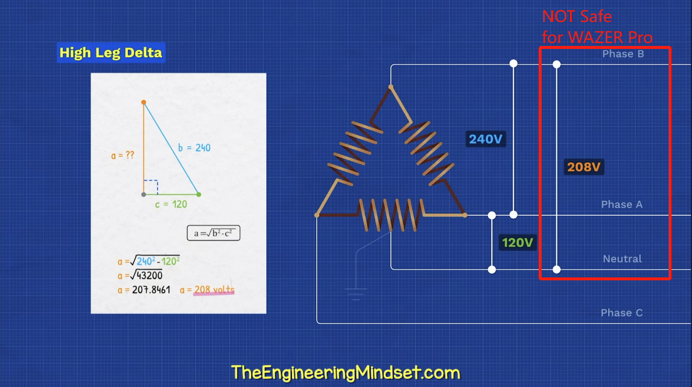In the 60hz region, the 220-240V split phase for WAZER Pro is achieved by combining two Hot/Legs/Lines of 120V at antiphase. But not all power supply has split-phase set up pre-installed. Sometimes 208V is measured between two legs/lines. So, it is safe to be used for WAZER Pro?
