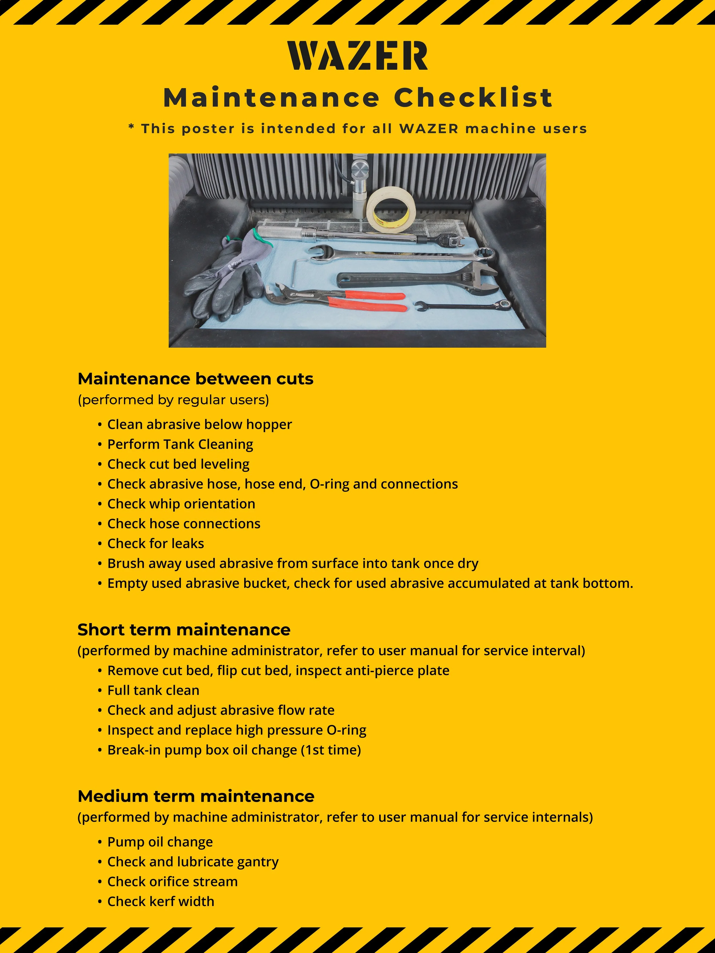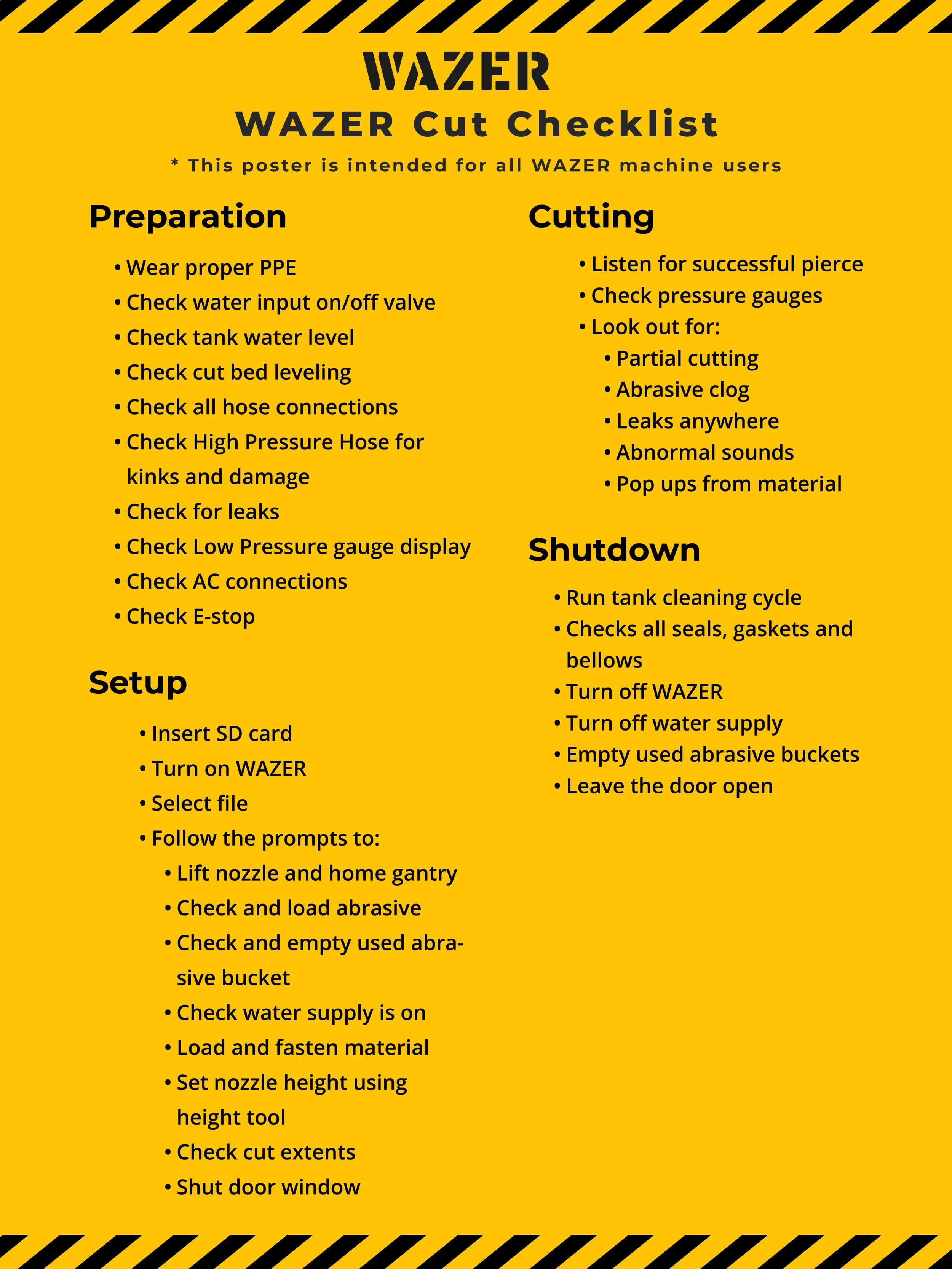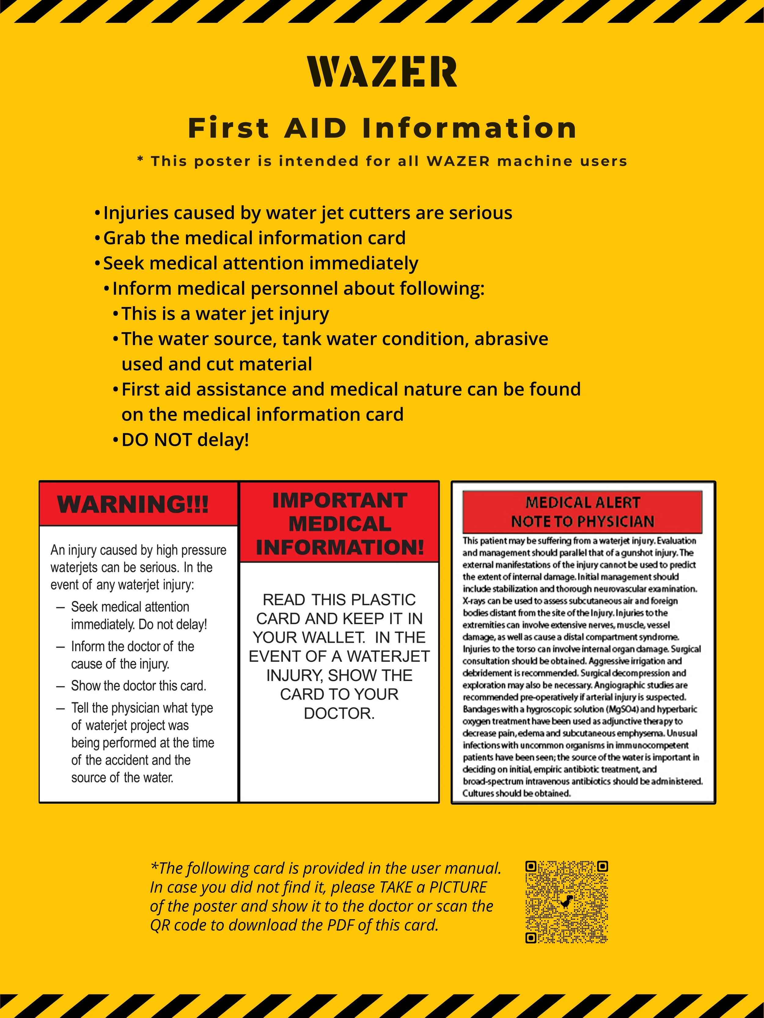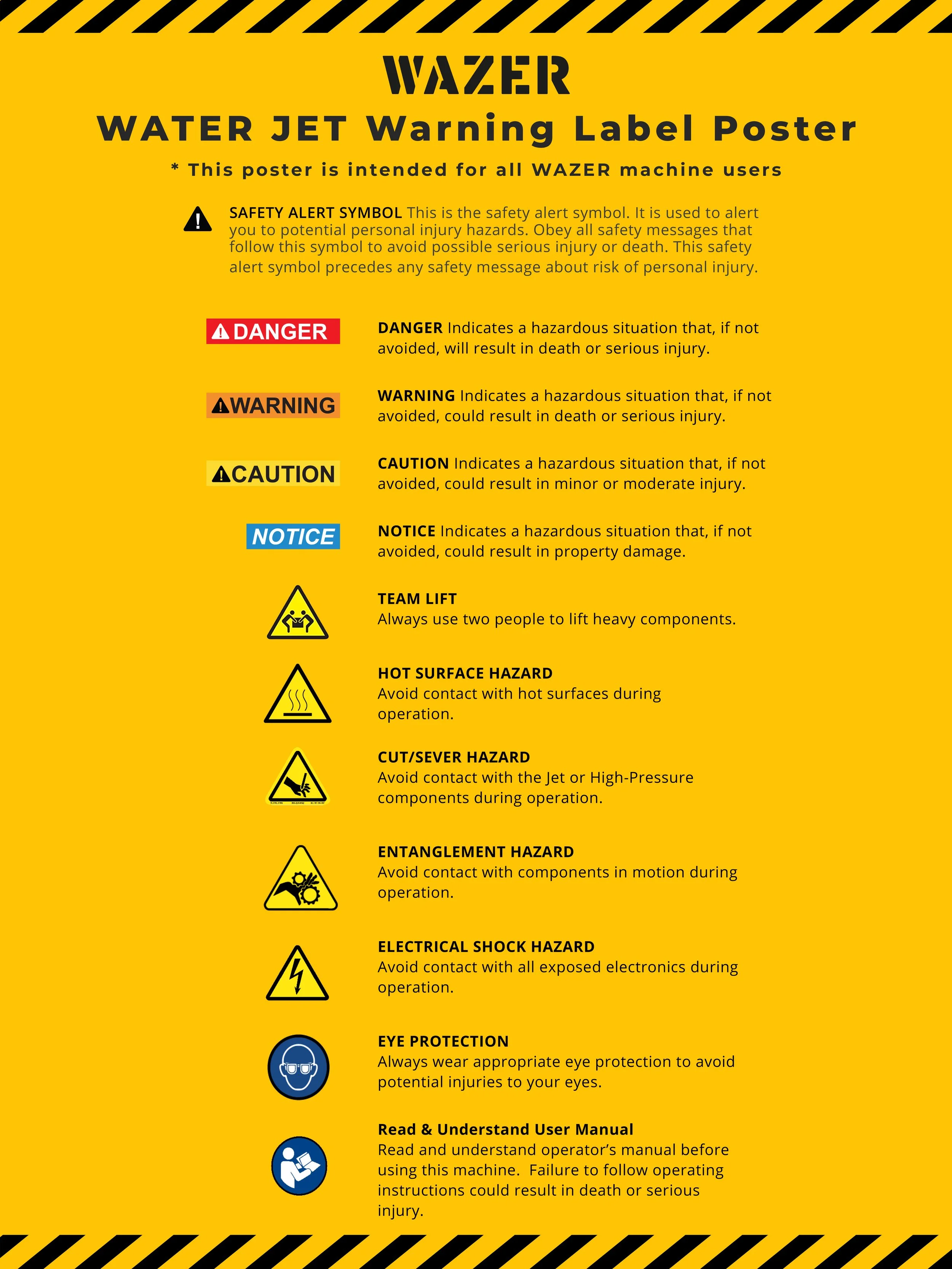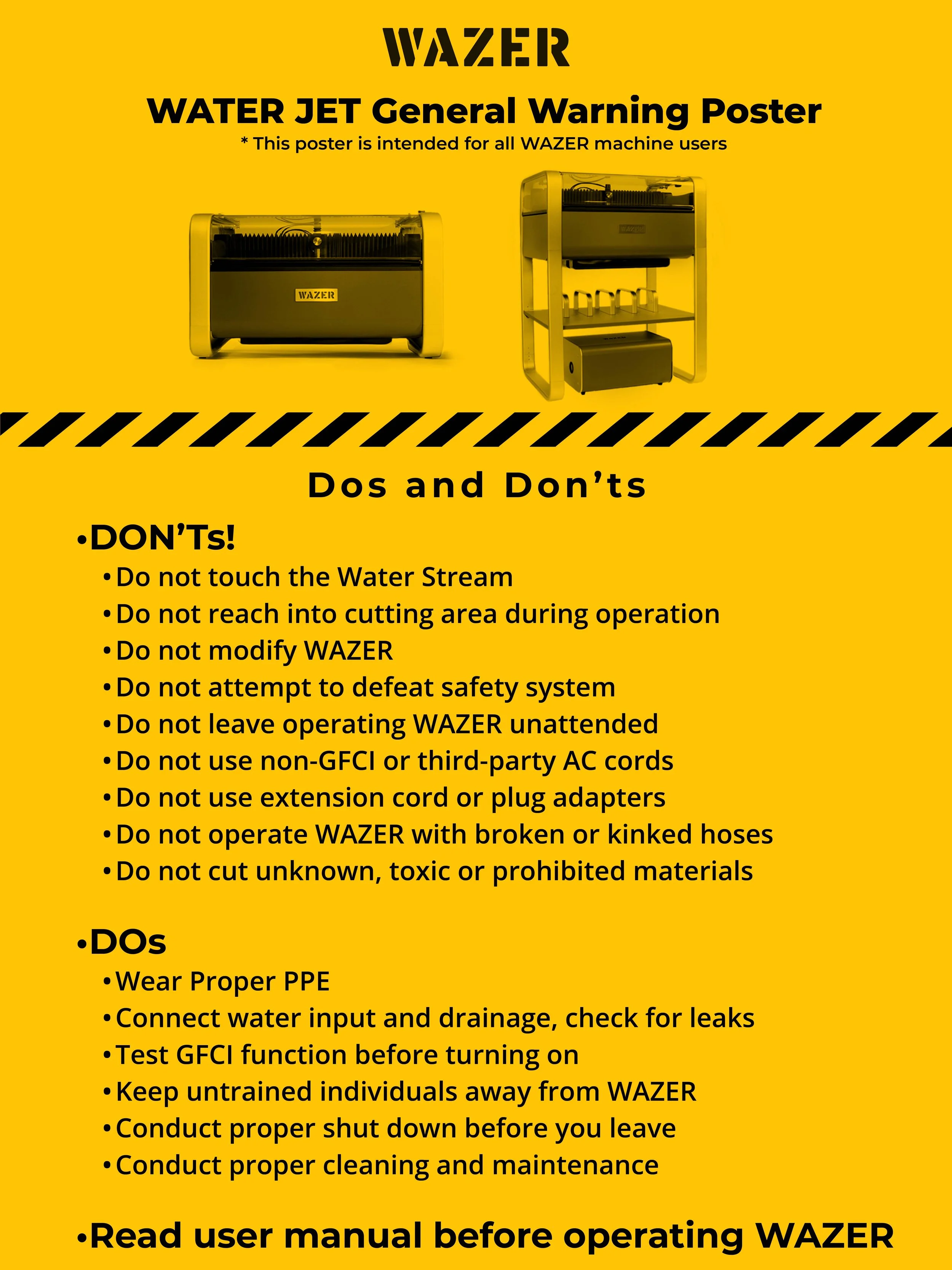 There are 5 different WAZER safety posters. Each poster have two color schemes: black/white and Yellow. They are extracts of the safety information provided in the user manual. Always refer to the user manual as reference and source of safety information.